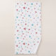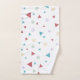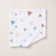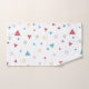 A modern, cute and chic bath towels with geometric shapes of triangles and swirls in pastel green, yellow, red and violet colour.