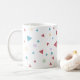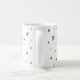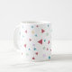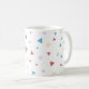 A modern and chic classic mug with geometric shapes of triangles and swirls in pastel green, yellow and red colour.
