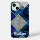 Chic girly faux Glitter silver blue geometric squares iPhone 15 Case. To make it extra special, it is also monogrammed and personalized with name or initials or any text you like, click the "customize further" link and use the design tool to modify the design if you like.