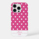 Add a touch of playful charm to your phone with this chic iPhone 15 Pro case featuring a pink and white white polka dot pattern. Designed for those who love a fun and feminine style, this case is also customizable to make it uniquely yours. Personalize it with your first name in a beautiful script, and add your initials in a stylish monogram for an extra dose of sophistication. Also makes a great gift for birthdays and all occasions.
