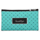 This super stylish makeup bag has a turquoise background and a connected black polka dot pattern. Personalize with your name.