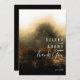 artistic and elegant wedding thank you card with golden misty watercolor landscape abstract painting with side bride and groom names, thank you typography and details in front and plain black in back.