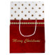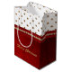 Glamourous holiday gift bag done in graphics of a red on red embossed looking pattern, on the bottom half and solid white, with gold glittery polka dots, on the top half. Graphics of a red ribbon, runs across the middle of the bag, with gold glittery beads. Gold tone graphic text, on both sides, reads Merry Christmas. Customize this chic Christmas gift bag with your own text.