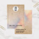This earring display card features a pinstripe black border, a place to add your logo, and matching simple but elegant black typography on a faux printed gold glitter with pink, peach, blue, and purple iridescent holographic ombre gradient glamourous and chic background. On the back, it includes contact information that can be changed completely or personalized to your details. It's a professional, elegant, and stylish way to display your product with pride. (earring holes are printed markers only, puncturing must be completed by the customer)