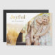 Chic, modern holiday design featuring sleek custom "Joyful" script in gold gradient style with unique curved photo template and subtle gold watercolor style winter landscape.