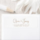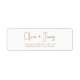 Modern white return address label for your engagement announcements, save the dates, wedding invitations, thank you cards and newlywed correspondence featuring your first names in a chic gold script and your address in classic serif typography.