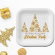 A chic gold script Christmas party paper plate with your family name under beautiful trees made of golden snowflakes above Merry Christmas. Trendy holiday decor with an artistic design.