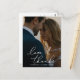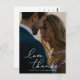 A modern and elegant photo thank you postcard designed to accommodate your favourite vertical or portrait oriented wedding photo with "love and thanks" as a white script text overlay. Personalize with your names and/or wedding date beneath.
