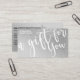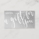 This is the perfect gift certificate business card for a trendy, stylish, girly, and modern businesswoman. This design features a simple white handwritten brush script typography on a faux printed sparkly silver glitter and light grey ombre gradient glamourous and chic background. It's the perfect way to allow your customers to buy a gift for their family and friends and at the same time promote your business.