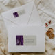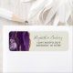 The left-hand edge of this elegant modern wedding invitation return address label features a purple watercolor agate border trimmed with faux gold glitter. The customizable text combines charcoal grey handwriting and copperplate fonts on an ivory background.