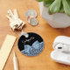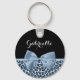 A chic and stylish dusty blue and black jaguar print keychain with a light blue ribbon tied into a cute bow. Personalize this trendy leopard style animal print design by adding the name of your teen girl. Flat printed image, not actual bow.