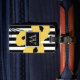 CHIC LUGGAGE TAG_MOD "PRIMROSE YELLOW" AND BLACK FLORAL POPPIES ON BLACK AND WHITE STRIPES. BLACK CENTER WITH AND WHITE MONOGRAM. BLACK BACK WITH WHITE INFORMATION TEXT.