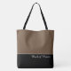 This lovely fashion forward tote bag shows the word "Maid of Honour" in white text colour over black with the upper tote bag in custom Latte Brown. Has plenty of room for personalized text. Graphics and text are on both sides of this tote bag. Black handle. Customize further or buy as shown.