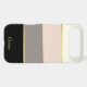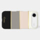 Cover your phone in a fashionable case featuring chic modern stripes in black, grey, blush pink and creamy eggshell white. Thin faux-gold lines separate the colours in designer style. Personalize with your name, monogram or other desired text. You can also delete the sample name shown if you prefer the case without any text.