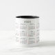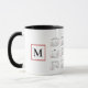 Stylish mug features a 2025 calendar with black weekdays and red weekend dates across the middle with your monogram in a chic black font within a red square on each side. Add your initial in the sidebar. The mug has a black handle and interior which you can customize in the sidebar.