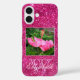 Give mom, grandma, girl friend, or special friend a beautiful custom pink girly glitter phone case with a cherished photo that she carry wherever the phone goes.The case now features a place holder photo of a green anole lizard perched on the petal of a beautiful pink tropical Hibiscus flower surrounded by greenery. Pink and green are prominent colours in nature. Replace the placeholder photo with her favourite photograph like one from Instagram or if you like the floral placeholder photograph keep it. Choices rock. Fill in the template name and initial, remove the text or use the edit design tool to select a font style, size, and colour you prefer.