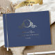 Personalize this elegant monogrammed wedding guestbook featuring real gold, silver, or rose gold foil on exquisite monogram and front, spine, and back text. Navy blue cover background colour in luxurious velvety-soft texture, and beautiful modern calligraphy details in a clean, minimal, and sleek style. Three size options with three inside paper-type choices. Personalize the guestbook with your monogram initials and wedding date on the front, your choice of text for the spine, and a smaller monogram with your initials on the back and one text section for your date, any other message you like, or if you prefer the design without this section, leave the corresponding template text box in blank to delete. Monogram with initials in calligraphy. Part of our "Navy Blue Watercolor Botanical Monogram" wedding collection with many coordinating products available.