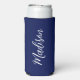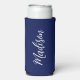A chic personalized navy blue monogram seltzer can cooler for a guy or girl who loves simple, handwritten gifts. Beautiful white cursive script down the side spelling out your name in elegant script.