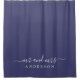 Chic navy blue monogram shower curtain with the text Mr and Mrs in white elegant scrip. You can customize this stylish design with your married name. Perfect luxury gift for the newlywed couple. Exclusively designed for you by Happy Dolphin Studio.