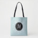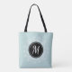 Stylish tote bag with personalized monogram with pale blue & white floral wreath design.