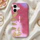 A modern chic iPhone case, tailor-made for those who adore a hint of opulence. A graceful shade of pink, adorned with a shimmering, sparkling texture, sets the stage for elegance. The left side boasts an enchanting arrangement of golden leaves, adding an extra layer of allure. Personalization takes centre stage with your name, artfully scripted in cursive, alongside your initial letter presented in a sleek, modern sans-serif font. This case is not just an accessory; it's a reflection of your unique style.