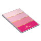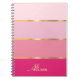 Organize your thoughts in style with this chic notebook, adorned with an array of pink stripes ranging from soft pastels to bold hues. Gold lines separate the colours, adding a touch of luxury to the design. Customize it with your name, monogram, or any text you like, or keep it simple by removing the sample text. This notebook combines fashion and functionality, making it a perfect accessory for your desk or a thoughtful gift.