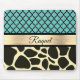 A chic quatrefoil pattern on a turquoise backdrop along with a gold ribbon for personalization and below that is stylish giraffe print for animal exotic vibes.