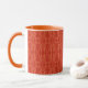 A chic White Coffee Mug with an Orange lip and handle and a delicate, damask-like pattern of Poppy outlines in Orange on a Poppy Red background. Part of the Posh & Painterly 'Poppy Fields' collection.