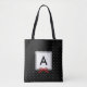 Chic monogram tote bag featuring a black bordered square with a red ribbon against a black and white polka dot pattern. Great as gifts for family and friends or for yourself.