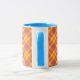 A chic White Ceramic Coffee Mug, with a Blue lip and handle and a Plaid pattern in Bright Red, Yellow and Blue. Part of the Posh & Painterly 'Rangoli' collection, this bold, tiled pattern can be adjusted to fit any Coffee Mug.