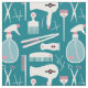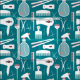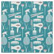 Hair stylist fabric in a chic retro design with hair salon tools in white and pink with cute little hearts against a teal background.