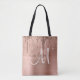 Add a touch of glitter and glam to your outfit with this elegant personalized tote bag. This chic design template features a large script monogram and your name to personalize on a background of rose gold brushed metallic texture accented by a border of faux dripping glitter. A unique girly gift for birthday, holidays and any special occasion. Designed just for you by Extreme Tees!