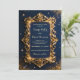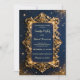 Invite your guests to an evening of splendor with this Regal Gold Baroque Frame & Navy Blue Wedding Invitation. Building on the luxury of our matching suite, this invitation features a magnificent, 3D-effect ornate gold frame that beautifully encapsulates your wedding details. The deep midnight blue backdrop is illuminated by a shower of celestial gold dust and twinkling stars, creating a romantic, high-drama atmosphere perfect for a formal evening ceremony.