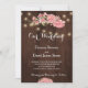 Floral blush pink peonies and shimmering lights on dark brown barn wood background making a rustic country trendy wedding invitation template. The invitation is ideal for elegant outdoor, garden, spring, summer, fall weddings or other parties.