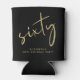 Fun black can coolers for her 60th birthday party featuring "sixty" in a chic gold script and her name in modern lettering.