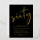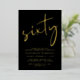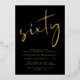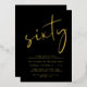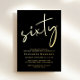 Chic black 60th birthday party invitation featuring "sixty" in a large stylish script, your name in elegant serif typography, and the party details in simple, modern lettering, all rendered in your choice of genuine gold, silver or rose gold foil.