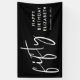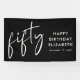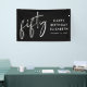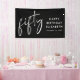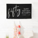 Chic black 50th birthday party banner and welcome sign that features "fifty" showcased in a stylish white script and your name and the date in modern white lettering.