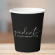 Chic black graduation party paper cups featuring "graduate" in a modern white script and the grad's name and class year in simple white typography.