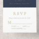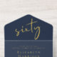 Elegant dark blue 60th birthday party all-in-one invitation that features "sixty" in a large chic script, your name and "RSVP" in classic serif typography and the party details in simple lettering, all rendered in your choice of genuine gold, silver or rose gold foil. A white tear-away RSVP postcard provides a convenient envelope-free response option for your guests.