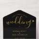 A stylish in one wedding invitation featuring elegant modern typography and a chic gold heart and monogram initials on a black background. The invitation includes a perforated RSVP card that’s can be individually addressed or left blank for you to handwrite your guest's address details. Designed by Thisisnotme©