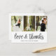 A modern photo thank you postcard designed to accommodate three of your favourite wedding photos aligned side by side. "Love and thanks" appears along the bottom in black handwritten style script. Personalize with your names and/or wedding date beneath.