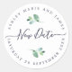 Chic, modern and simple new date postponed wedding classic round sticker features the text Ne Date in dark blue elegant handwritten script calligraphy on a white background with a stylish touch of green eucalyptus foliage. Simply add your names and new wedding date. Exclusively designed for you by Happy Dolphin Studio. If you need any help or matching products please contact us at happydolphinstudio@outlook.com. We're happy to help you make your wedding the most beautiful day!