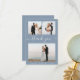 Elegant dusty blue wedding thank you card featuring "thank you" in a chic white script with swashes, a collage of 3 of your wedding day photos and your first names and wedding date joined with a heart. On the back, personalize your thank you message in simple white typography and add your names in a signature-like script.