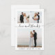 Chic wedding thank you card featuring "thank you" in an elegant script with swashes, a collage of 3 of your wedding photos and your first names and wedding date joined with a heart. On the reverse side, personalize your thank you message and add your names in a signature-like script.