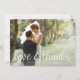 A modern wedding thank you card designed to accommodate your favourite full-bleed horizontal or landscape oriented wedding photos. "Love and thanks" appears at the bottom as a white text overlay in handwritten style script, with your names beneath. Add an optional message to the subtly patterned back using the field provided, or delete the sample text to add your own handwritten message of thanks.