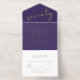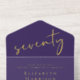 Elegant purple 70th birthday party all in one invitation featuring "seventy" in a chic script, your name showcased in elegant serif typography, the party details in simple, modern lettering, and a tear-away RSVP response card, all rendered in your choice of genuine gold, silver or rose gold foil.