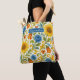 This beautifully designed tote bag, inspired by Mediterranean Italian style, features a vibrant floral and leaf pattern in shades of yellow, orange, blue, red, and green. There is ample space for customization, allowing you to add your name, monogram, or initials.