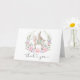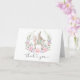 Elegant & stylish folded thank you card featuring soft greenery wreath, pastel pink & purple florals and an adorable bunny riding a sweet baby lamb.