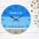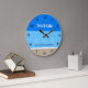 Personalize this Beach House Clock with your family name and add a Unique, Chic Touch to your Beach Home Decor. This beach house wall clock features a serene and tranquil design that perfectly captures the essence of a peaceful seaside escape. The clock face is adorned with stripes of cool blue, reminiscent of the ocean, blending seamlessly with the white and tan colours of the sandy beach, and rising suns over the sea. This beach house wall clock is not just a timepiece but a beautiful reminder of the soothing sights and sounds of the shore, making it an ideal addition to any coastal-themed décor. Also perfect as a Beach Housewarming party gift.