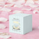 A lovely tea party themed baby shower favour box that features a soft baby blue, yellow and white colour scheme. An original illustration of a pretty china teacup is set against a pale blue stripe background and accented with a whimsical mix of typography.